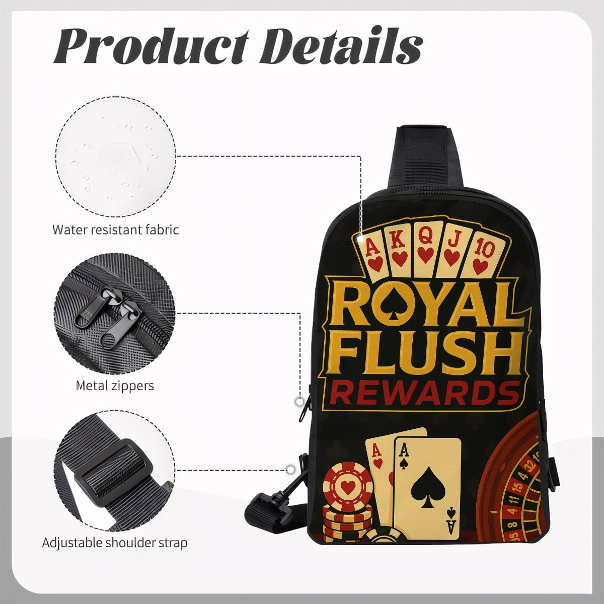 - Product Structure: Double main pocket, zipper opening and closing, outside main pocket single pull head. Interior main pocket double pull head, with 1 mesh patch pocket. The adjustable strap ranges from 28" to 47" and has clasps on both sides of the bottom, which can be adjusted left and right according to personal habits.